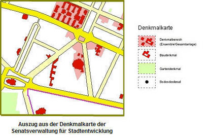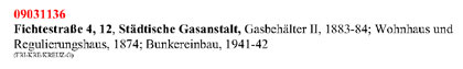 Fichtebunker gehört zu einem Denkmalensemble Dies zeigt ein Auszug aus der Denkmalkarte der Senatsverwaltung für Stadtentwicklung, auf der der Gasometer als denkmalgeschützte Gesamtanlage in einem denkmalgeschützten Ensemble dargestellt ist, sowie die dazugehörenden Textauszüge aus der Denkmalliste. (Rainer Kemnitz) ![]() ![]() ![]() ![]() |