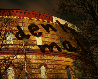 Das Denkmal Fichtebunker (Gasometer, Fichtestrasse, 10967 Berlin Kreuzberg) soll von einem Investor bebaut werden. Es sollen rundum und auf dem Denkmal Gebäude zum Wohnen entstehen. Gegen diesen Umgang mit dem Denkmal wehrt sich die Bürgerschaft mit der INITATIVE FICHTEBUNKER. Das Projekt GUTE GEISTER für den Fichtebunker dokumentiert diesen Widerstand, sowie die reiche Geschichte des Fichtebunkers. Ein Diskursrahmen für den Umgang mit Geschichte und Denkmal soll hier entstehen. Foto: "Denk Mal" Projektion auf Bunker von Gerhard Anke
